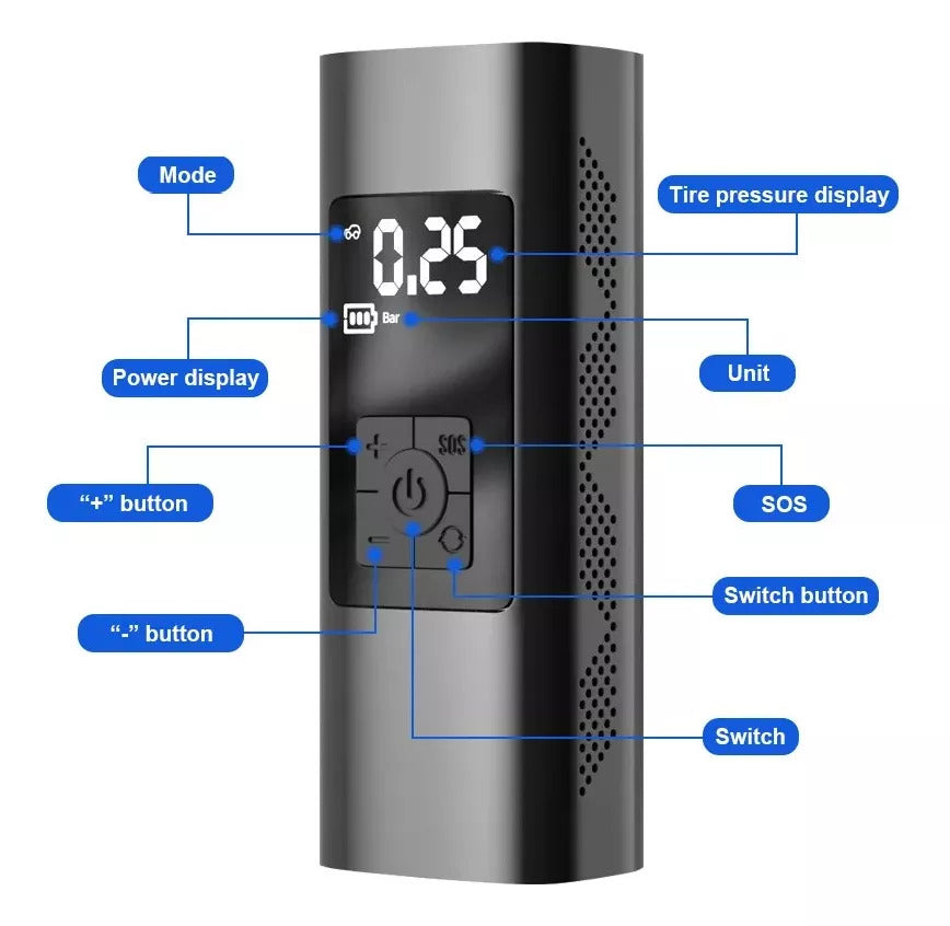 LCD Display- El compresor de aire de batería tiene un manómetro digital LCD con 4 unidades de medición de presión - PSI, KPA, BAR, KG/CM. La gran pantalla muestra con precisión las presiones de los neumáticos en tiempo real y preestablecidas, lo que facilita la elección del método de inflado correcto.