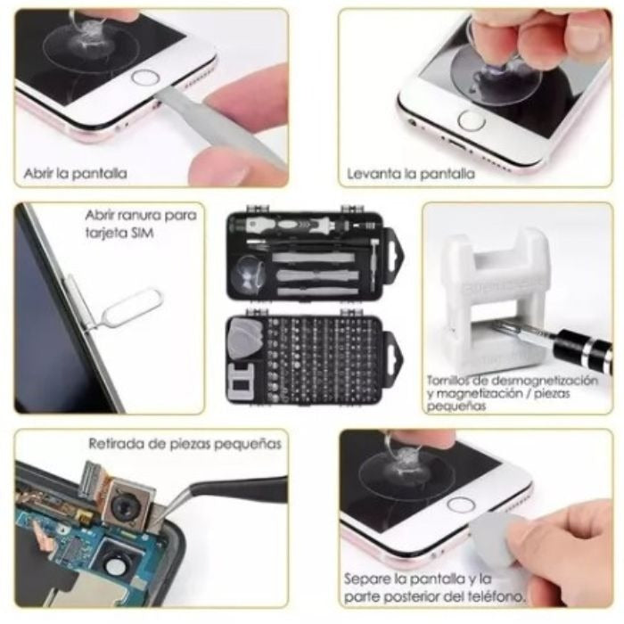 El kit definitivo para reparaciones electrónicas y de precisión. Incluye 100 puntas magnéticas y 15 accesorios para desmontaje: ideal para móviles, tablets, relojes, cámaras, computadoras y más.