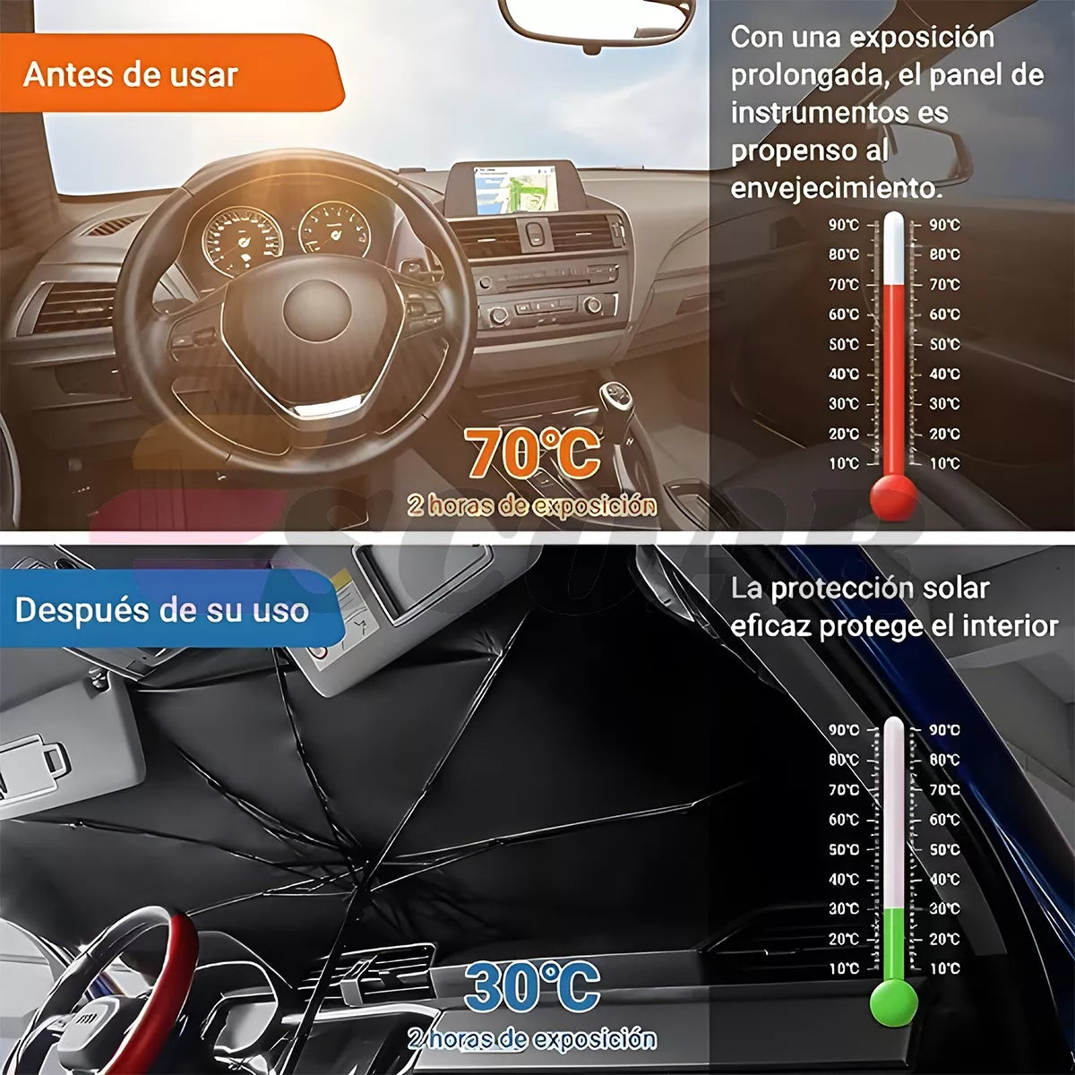 Protege el interior de tu coche: bloquea eficazmente el calor uv, no solo, espejo las luces del sol perfectamente, sino que evita que el salpicadero y la tapicería se desvanezcan y grietas, además de lograr un efecto mejor de sombreado y mantener el interior de tu vehículo fresco y cómodo vehículo. Simplemente abre y expande para adaptarse fácilmente al parabrisas de tu coche